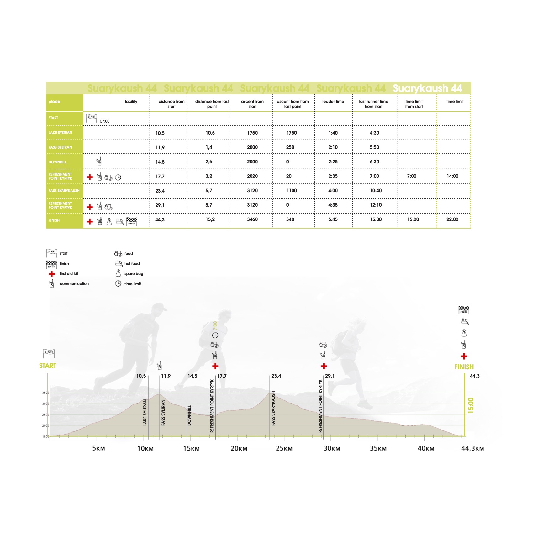The first kilometer from the start line runs on asphalt with minimum elevation gain. Poles are forbidden in this zone of the route. Next 5,5 km you go up along a dirt road with total elevation of 800m. At the end of the road there is a stream, where you can, for the first time since the start line, replenish water supplies. After crossing the stream the route goes up for 4 km with the total elevation gain of 800 meters. Winding through “kurumnik” (conglomeration of big rocks) the route will lead you to the Lake Syltran. After passing the Lake, you run for another kilometer among kurumnik with the elevation gain of 400 meters and go out the Syltran pass.